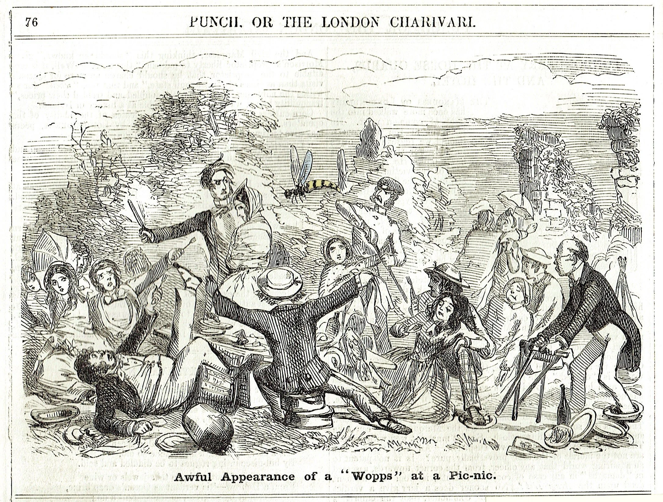 As an unexpected highlight, Ian Dickens brought along a handmade model of the ‘Giant Wopps’ — a playful nod to a Punch Magazine cartoon drawn during Dickens’s 1849 holiday. The original illustration by John Leech, a close friend of Dickens and regular Punch contributor, shows a group of terrified picnickers being ambushed by an enormous wasp — or “Wopps,” as it was labelled in full Victorian whimsy.